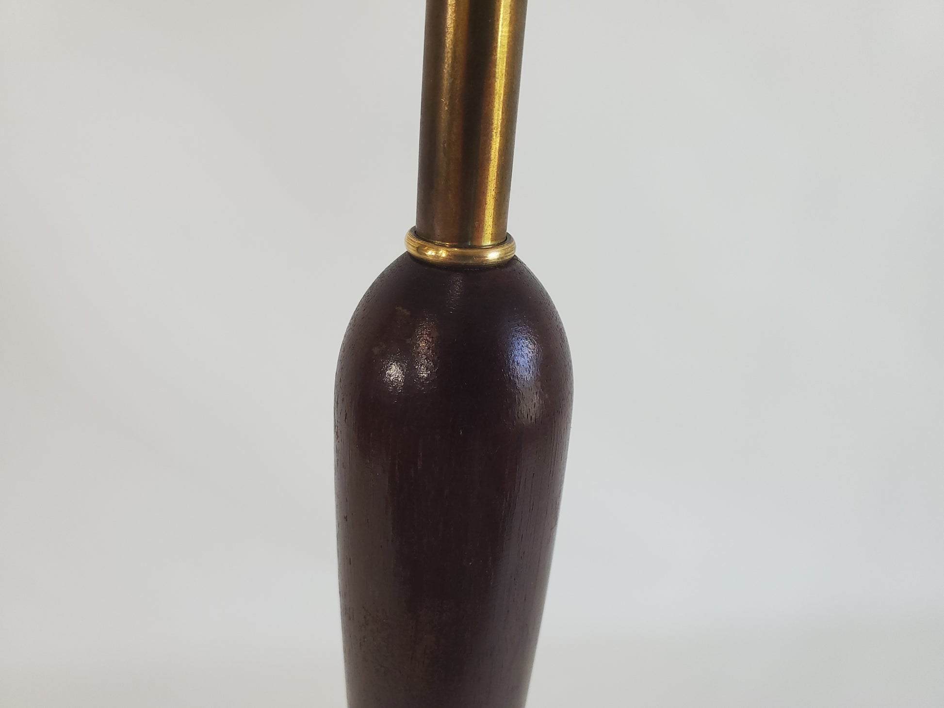 Bring classic Mid-Century Modern style to your home with this vintage 1960s table lamp by the Laurel Lamp Company. Made of dark walnut with brass accents, it reflects the simple, well-crafted design the brand is known for. The sculptural shape and clean lines make it a strong example of the period, comparable to designs from Stiffel and Lightolier.