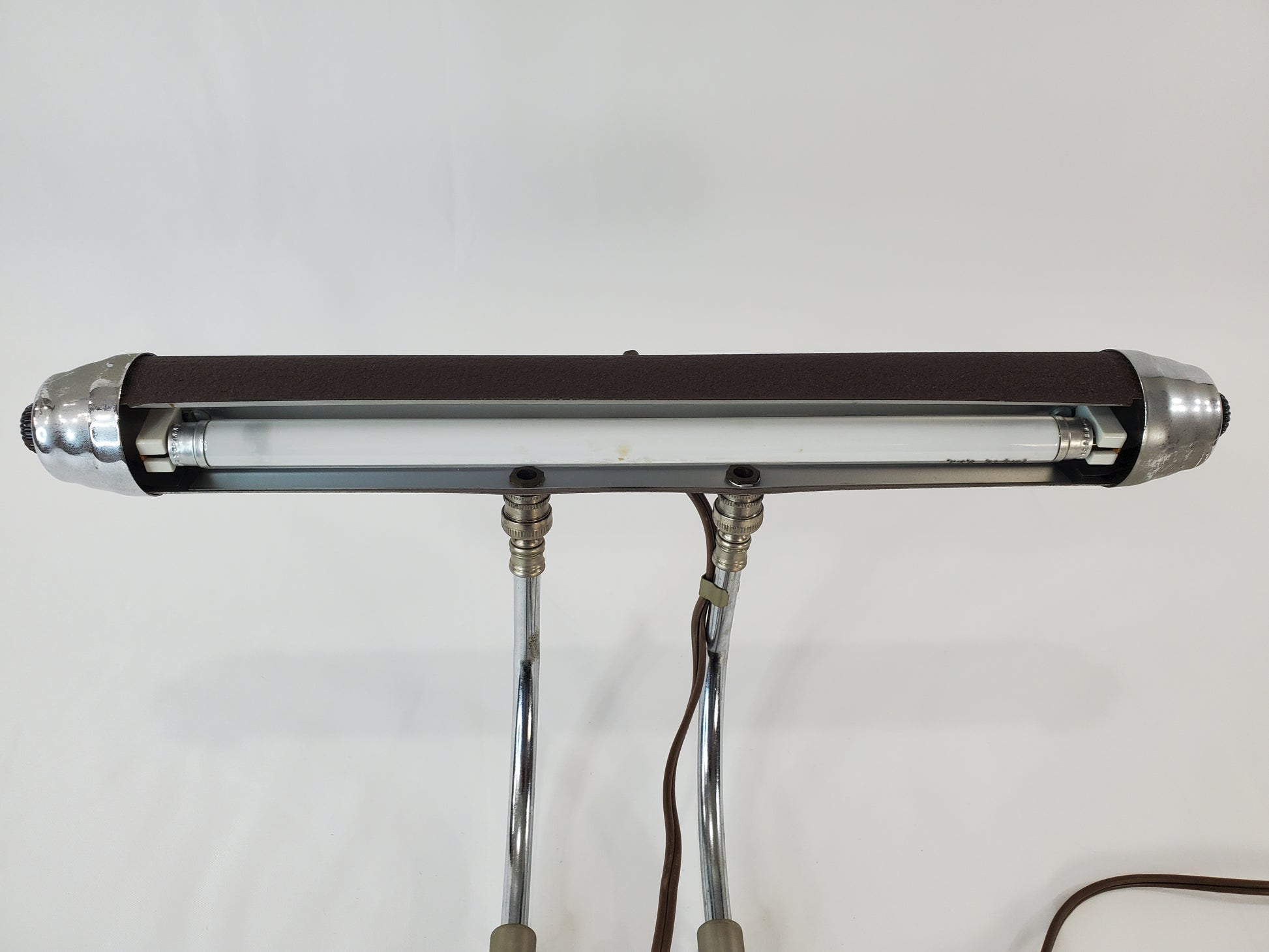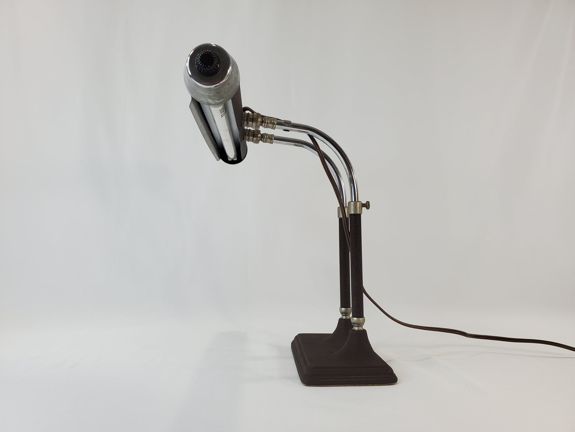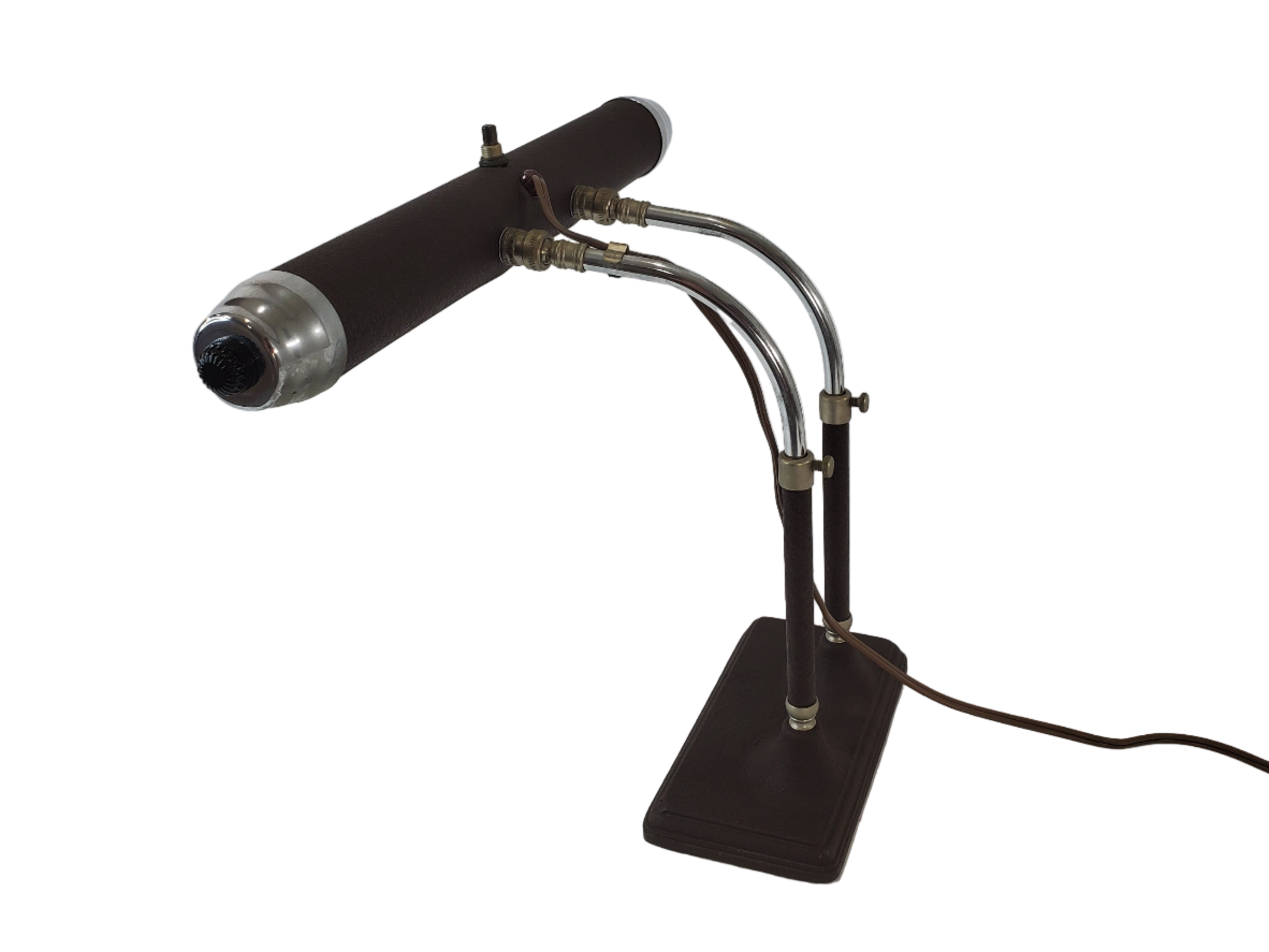 This specific model offers versatile functionality as both a desk lamp and a piano lamp, thanks to its twin adjustable chrome arms and tubular shade which provide focused lighting. The design is a great addition for anyone appreciating genuine vintage decor and mid-century lighting history.