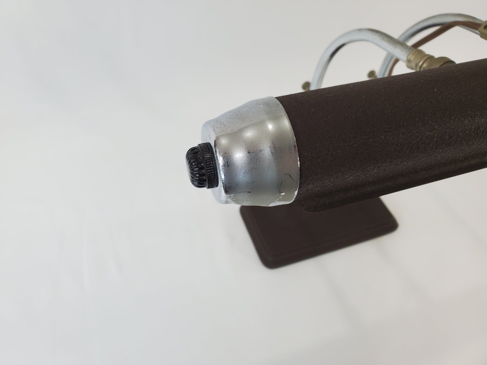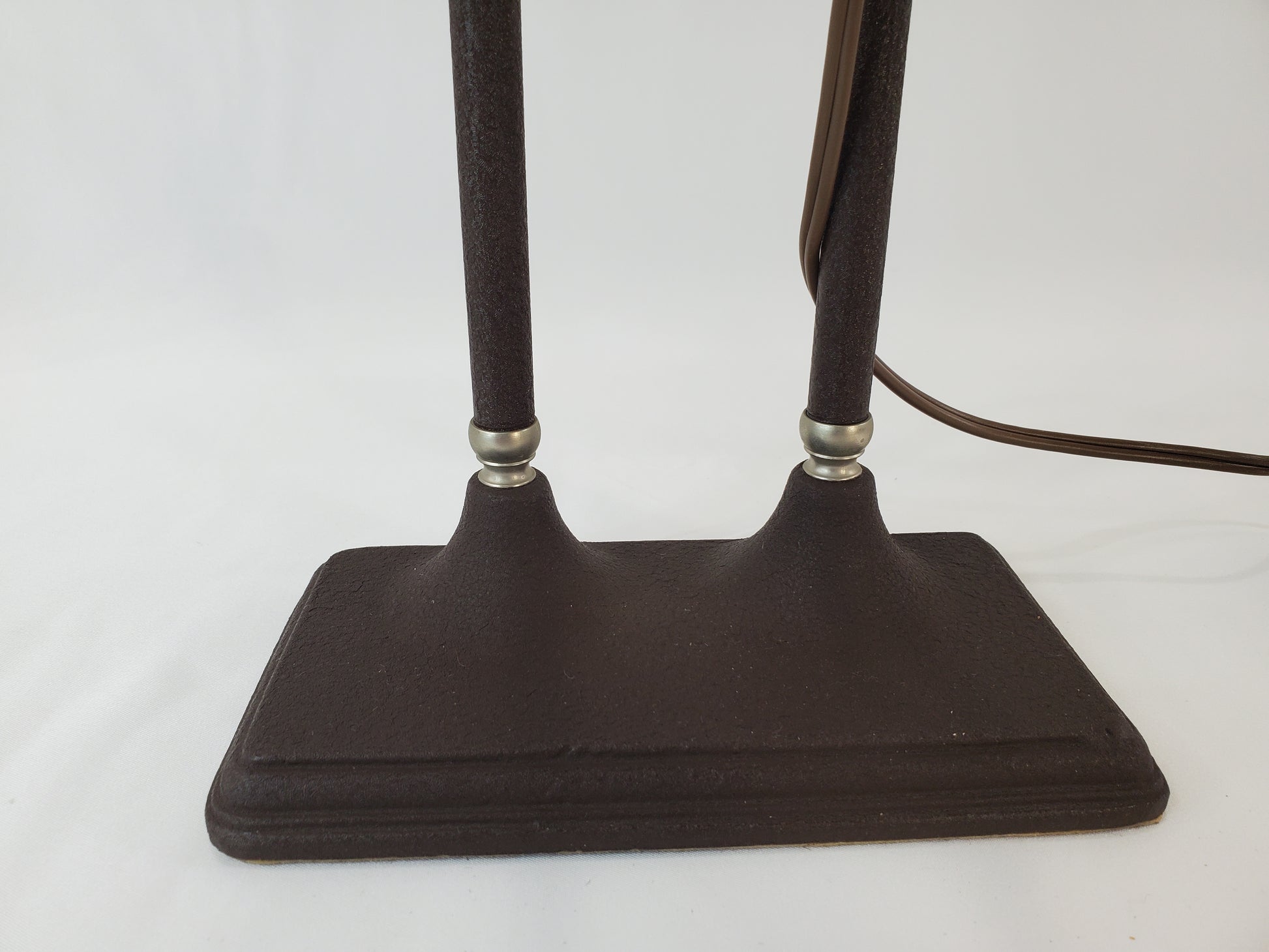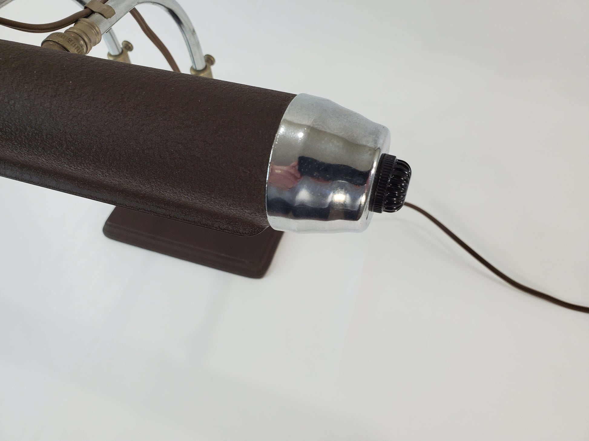 This specific model offers versatile functionality as both a desk lamp and a piano lamp, thanks to its twin adjustable chrome arms and tubular shade which provide focused lighting. The design is a great addition for anyone appreciating genuine vintage decor and mid-century lighting history.