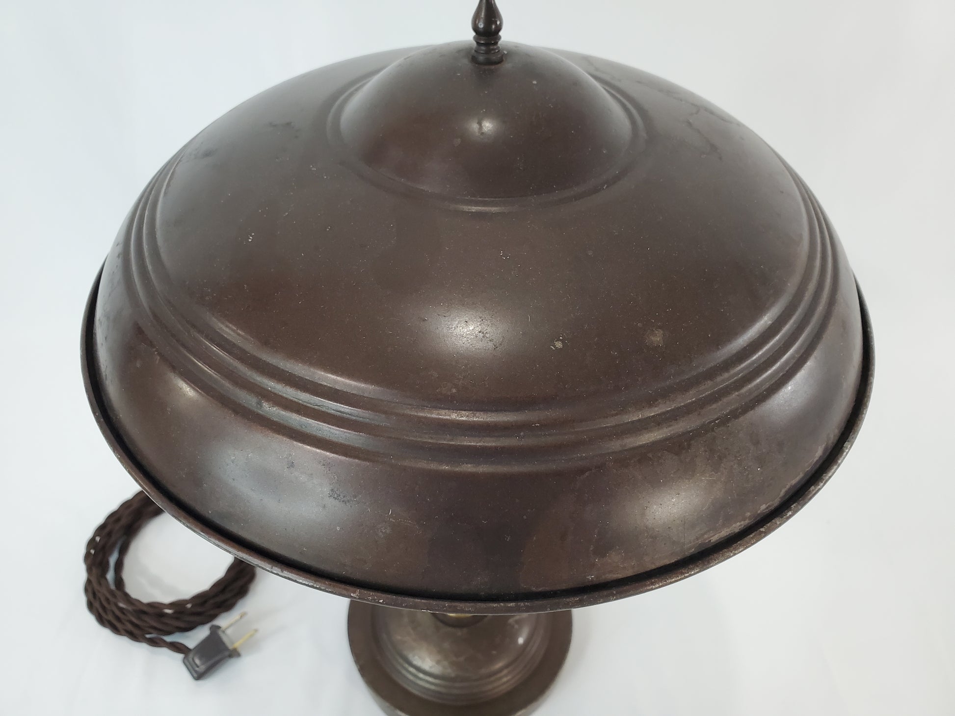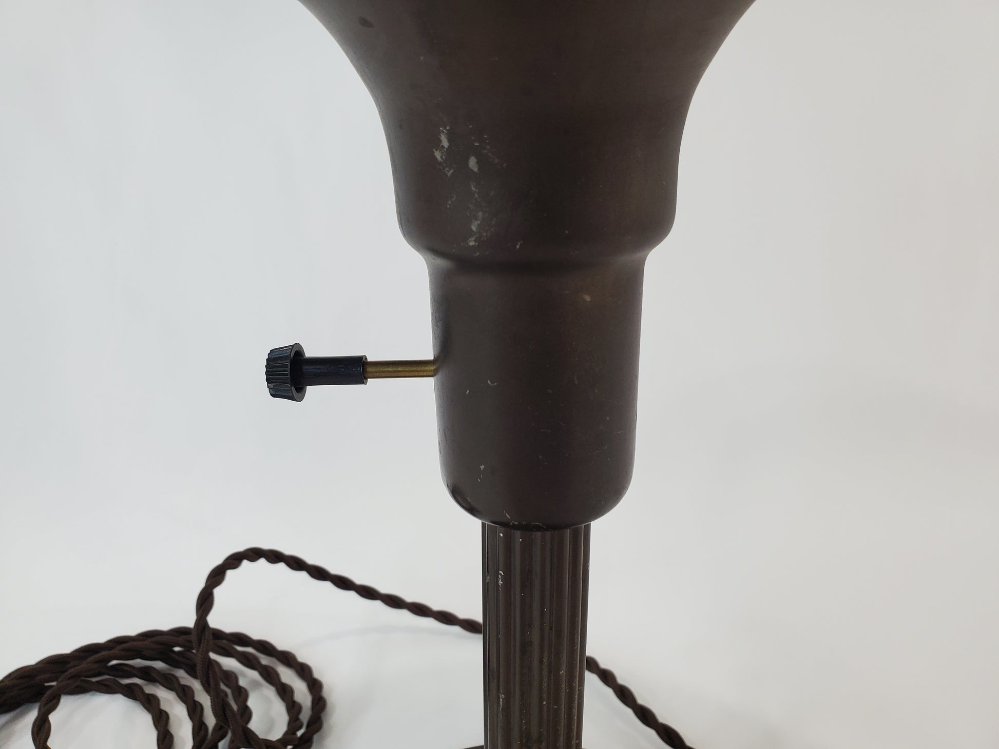 The lamp has an aged original metal finish that highlights its history and durability. The condition is consistent with a genuine vintage piece, and it has been rewired with a new, period-appropriate cloth-covered twisted cord and plug, ensuring both functional safety and aesthetic integrity. This is a unique item for the discerning collector looking for a genuine piece of design history.