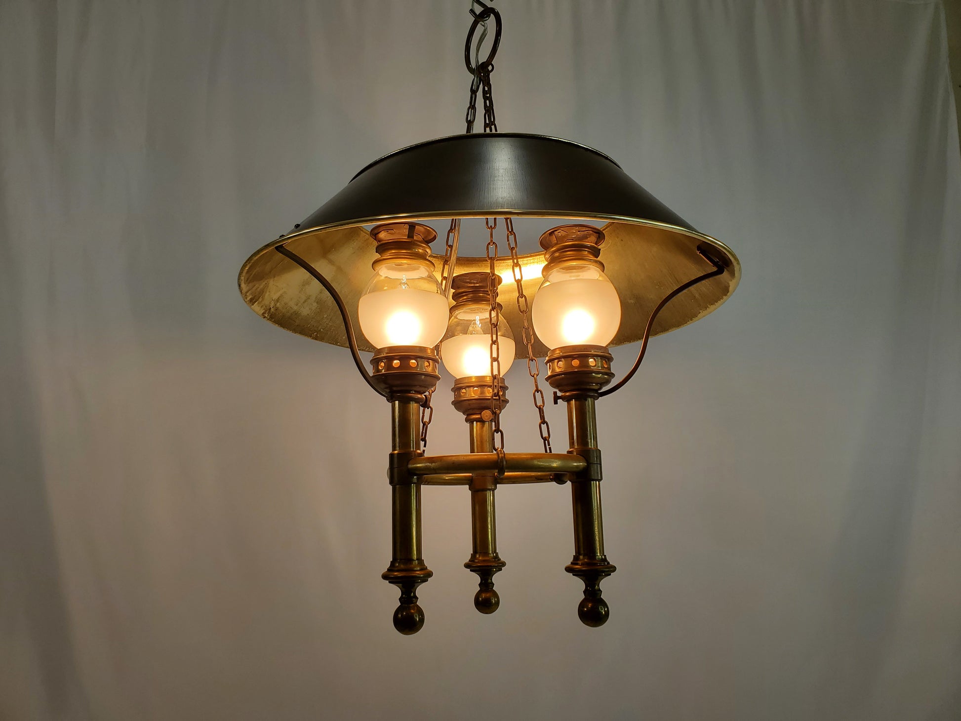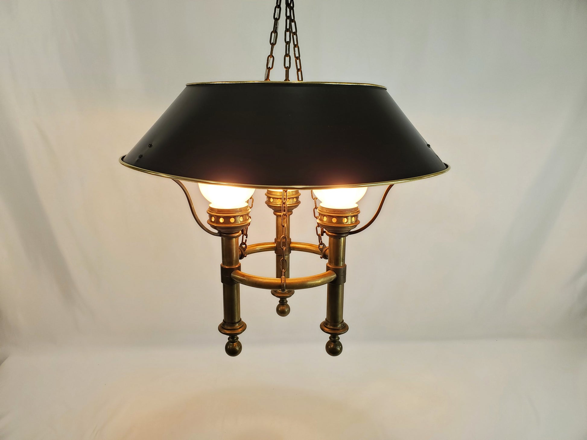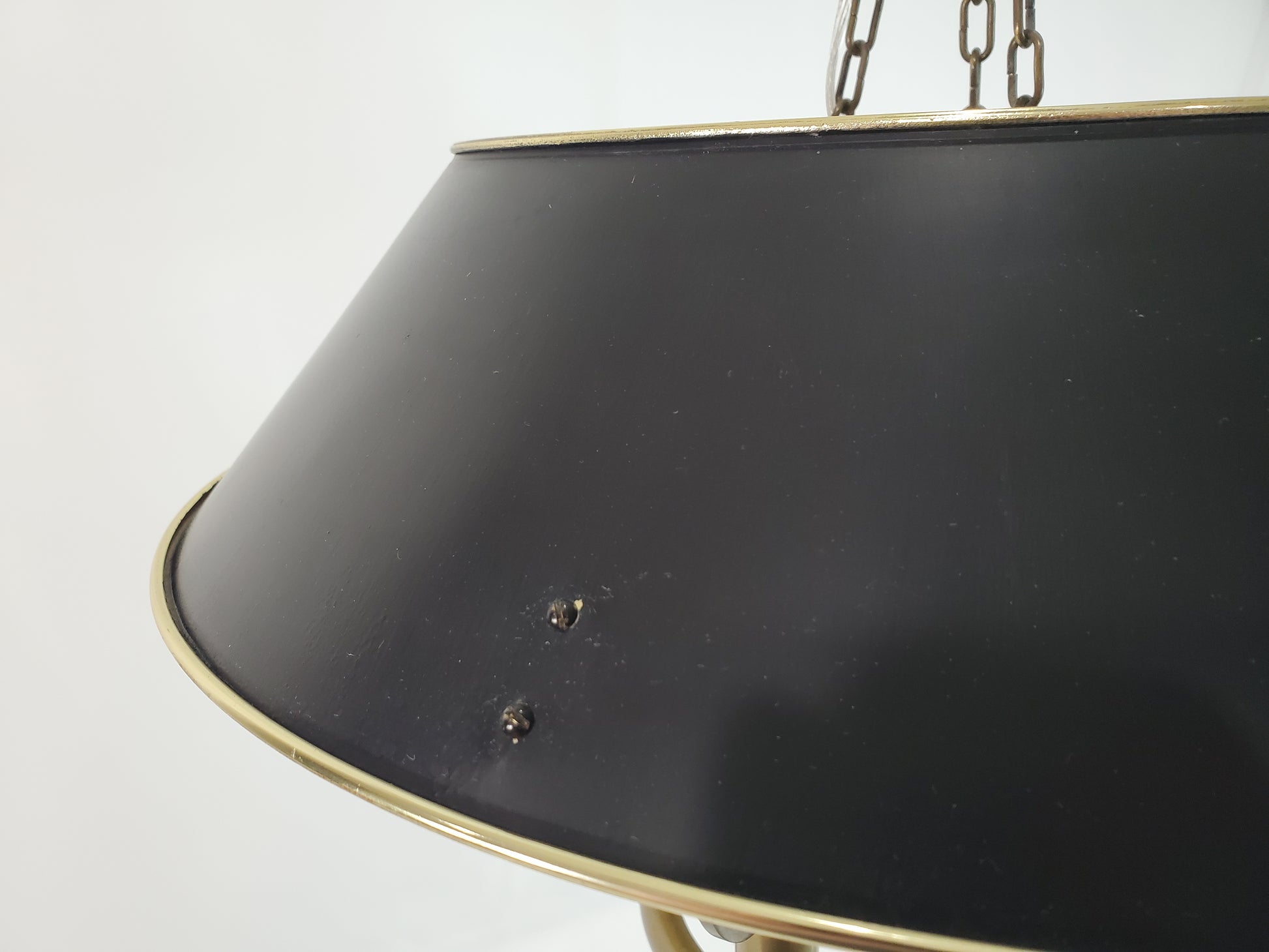 This vintage Chapman brass billiard / bouillotte chandelier is an elegant example of French Empire-inspired lighting, featuring a solid polished brass body and a classic black painted "tole" metal shade. Designed with a distinct triple-arm configuration, this fixture captures the timeless appeal of traditional bouillotte lamps in a hanging format, making it a perfect statement piece for your game room, dining room or library. Its balanced silhouette and warm metallic tones allow it to complement a range of interior styles, from classic traditional to transitional.